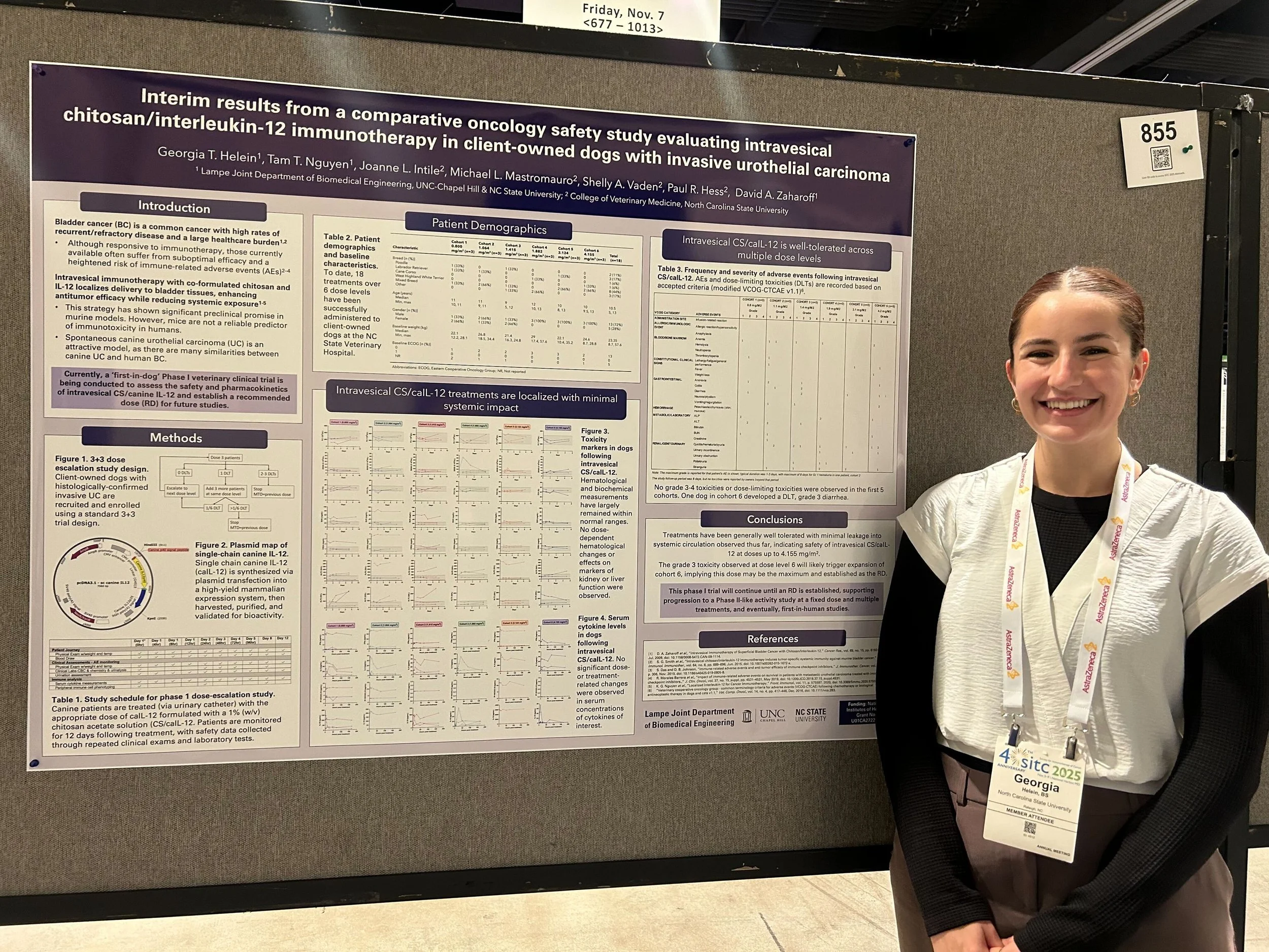 Georgia presented not one but two posters at SITC 2025 in National Harbor, MD. The first poster was an interim report on our phase 1 safety study of intravesical chitosan/IL-12 immunotherapy in pet dogs with bladder cancer. The second poster described in vivo updates on the lab’s injectable XCSgel technology for intratumoral localization of immunotherapy.